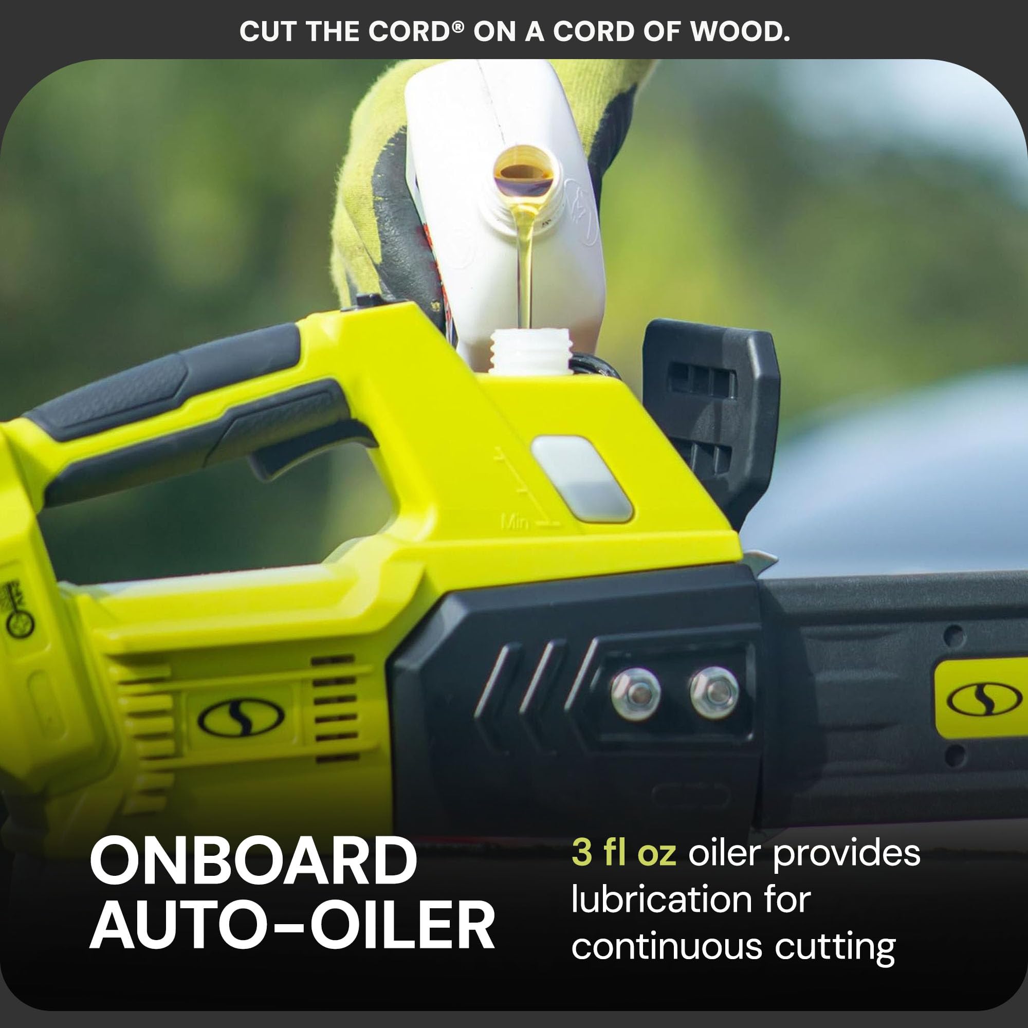 - Durable and Reliable: Onboard auto-oiler keeps the bar and chain lubricated for continuous, smooth cutting; safety features include a hand guard with kickback brake