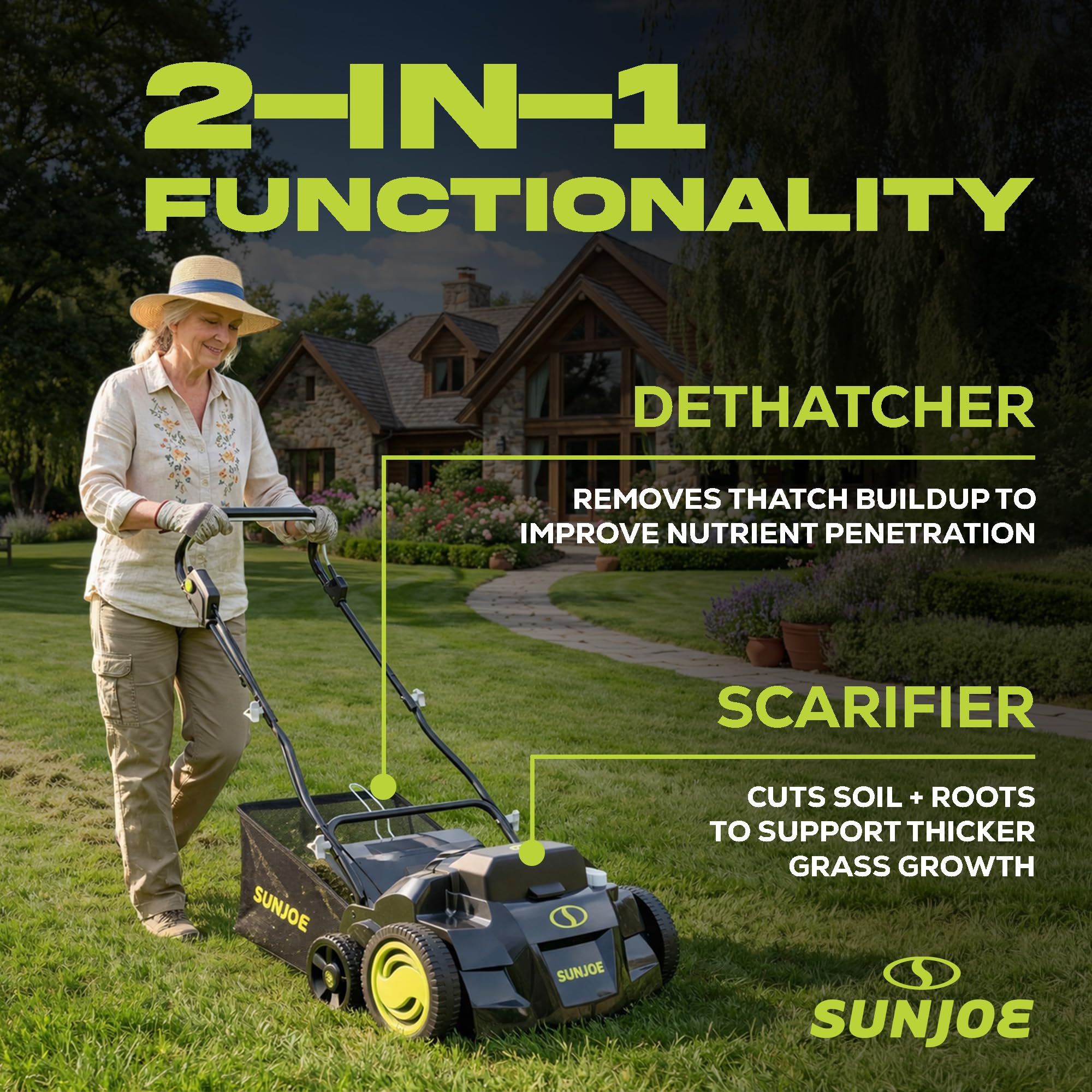 Sun Joe Cordless Scarifier & Dethatcher with 5 Depth Positions & 600W Brushless Motor, 15-Inch Cutting Width - Heavy-Duty Yard Trimmer Machine for Gardening Care and Lawn Maintenance, 24V-X2-DTS15