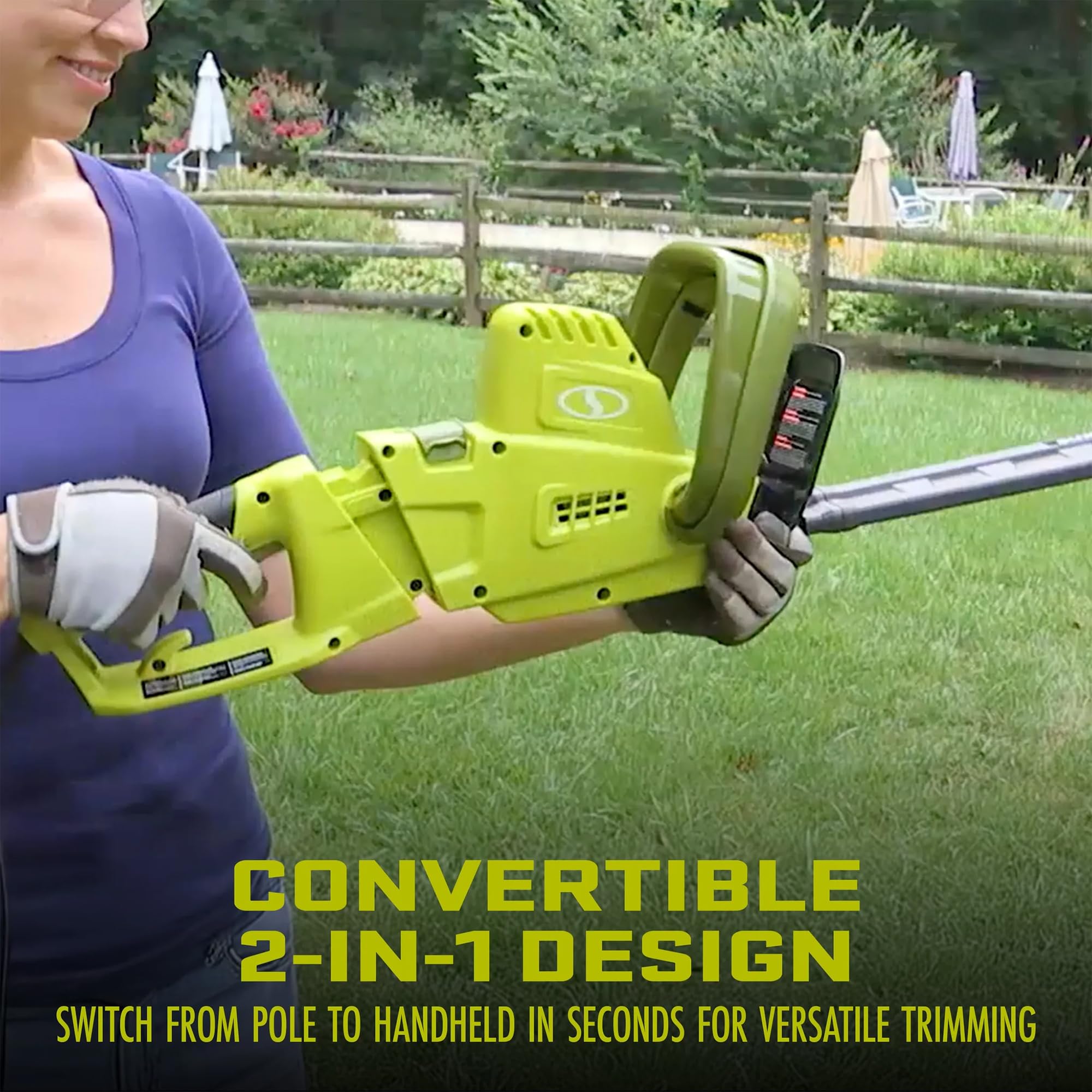 - Quickly swaps from electric pole hedge trimmer to handheld hedge trimmer in seconds